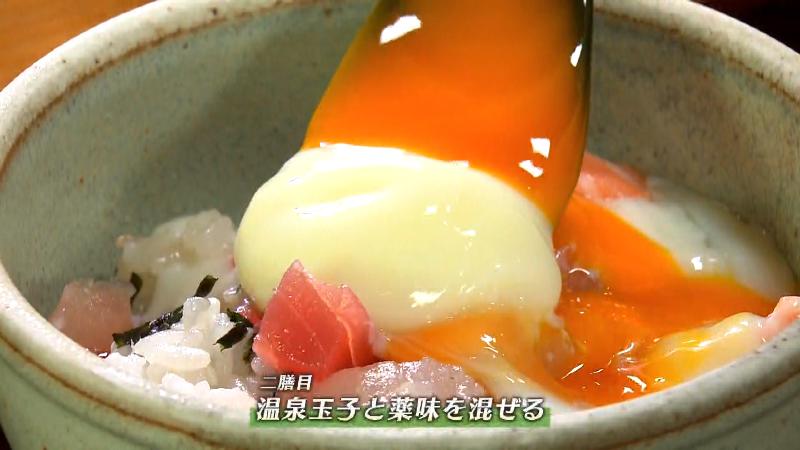 続いて二膳目は、温泉卵と薬味を混ぜて食べてみてください。