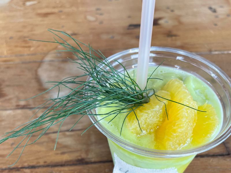 甘夏・パイナップル・小松菜が入っています。添えられているハーブのフェンネルは畑で栽培したものを使用しています。