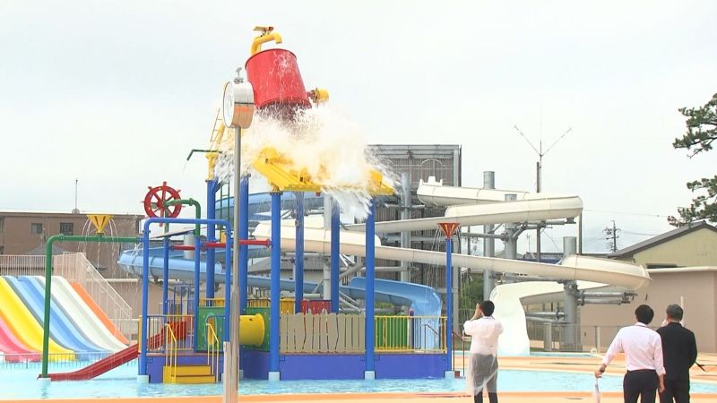 やってきたのはリニューアルした大浜公園プール。名物の水がドバッとひっくり返る赤いバケツを横目に、公園に沿って歩いて行きます。