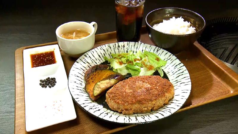 ラム肉100%、200gのジャンボなハンバーグに焼き野菜・スープ・ライス・ドリンクが付いています。