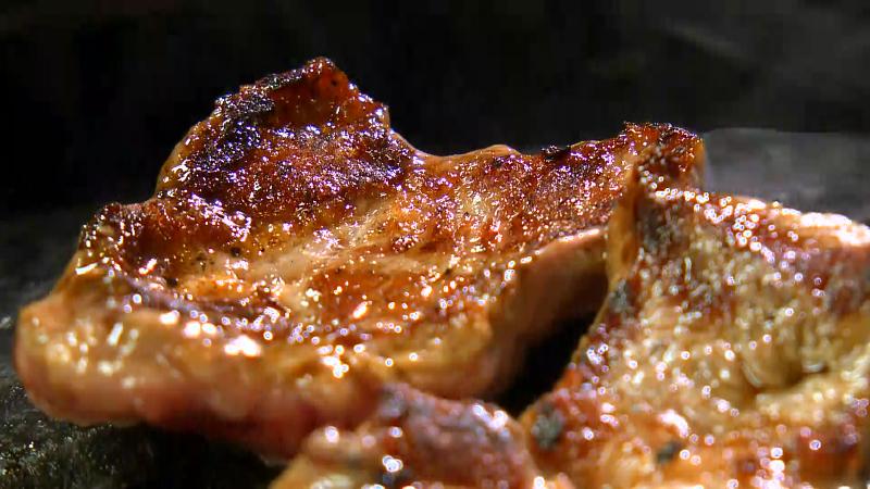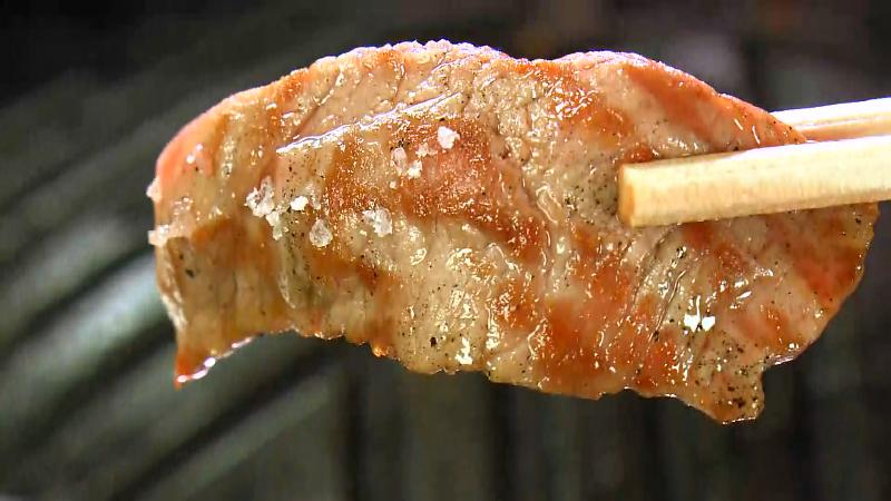 焼いたネギの上にロースの赤身の部分を乗せて、脂身の部分は鉄板に。ネギを枕のようにしてみてください。これを当店ではネギ枕と呼んでいます