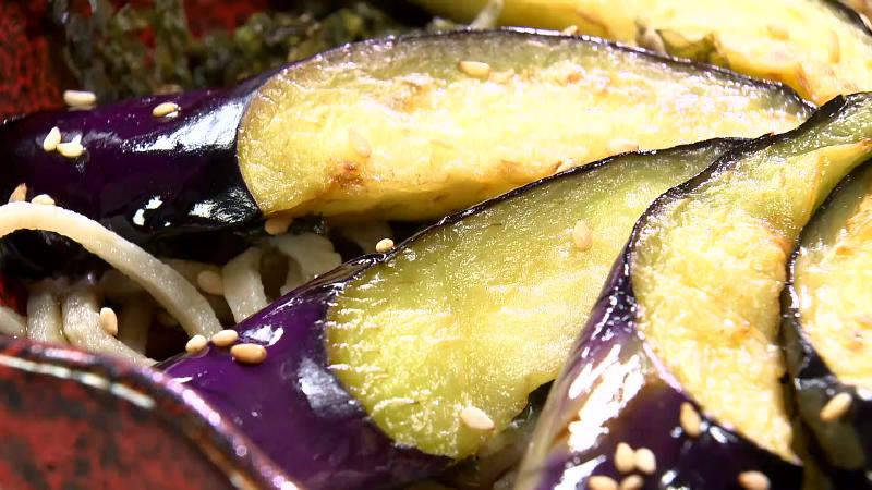 ナスにしっかり油が染み込むように調理しています。揚げすぎて皮が固くなったり、しなっとした感じにならないように適度な火加減を意識しています。油を含んでいるので、かめばかむほど味わいがじわっと染み出てくると思います