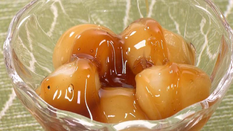 冷やしみつだんごは、レモンあんとは少し違って、冷やしても固くならないように砂糖を加えて甘いだんごになっています