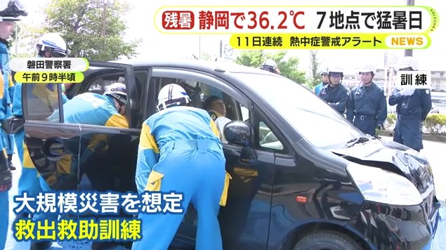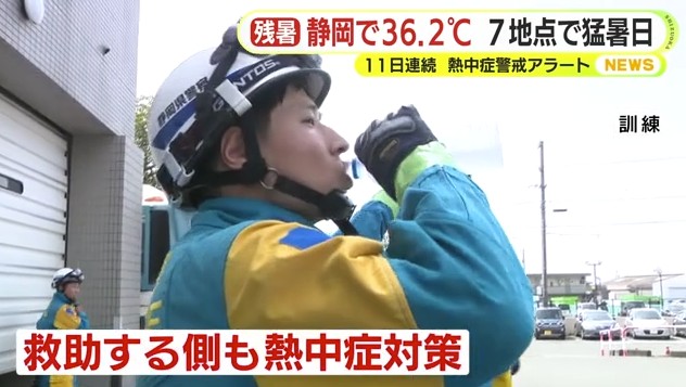 厳しい残暑が続いています。静岡県内は8月27日も朝から陽射しが照り付け7地点で猛暑日となりました。こうした中、磐田市で行われた大規模災害を想定した訓練でも熱中症対策がとられていました。