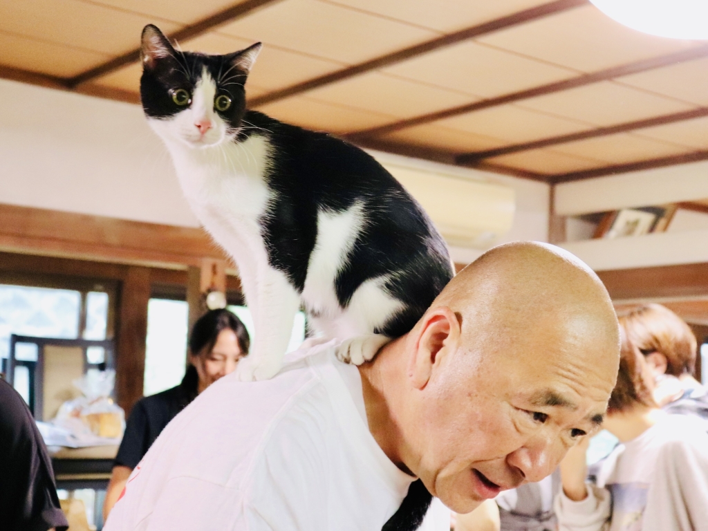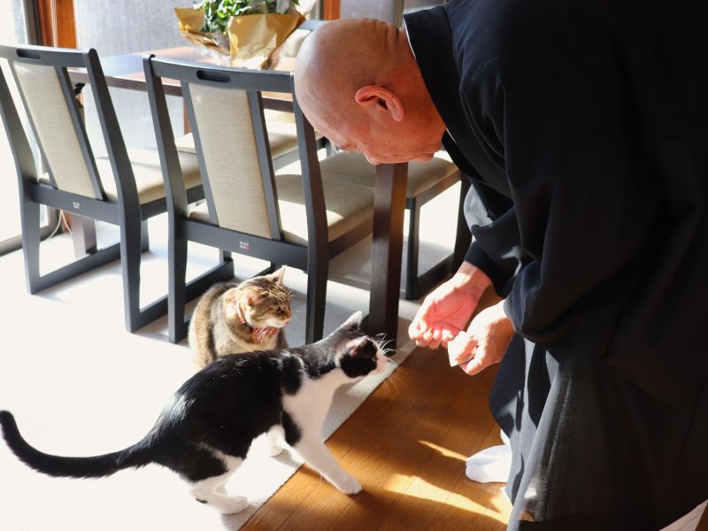 食後は住職家族とまったりして、一日を終えます。すいかは、毛づくろいをしてみけを気遣い、人間でいうと60歳ほどになる師匠を労わっているそうです。