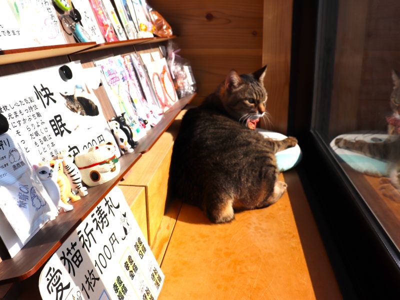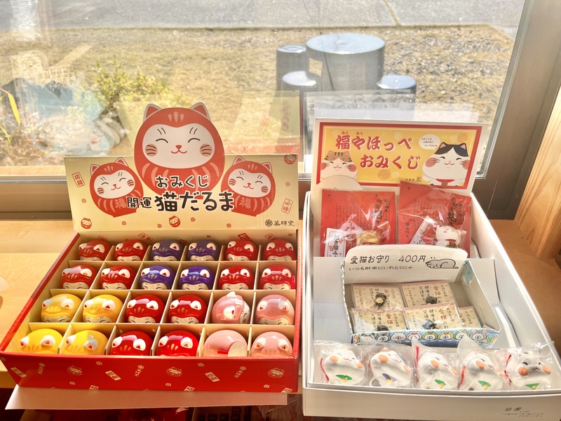 みけやすいかに会える寺務処には、ねこの寺ならではの御朱印やお守り、おみくじが並びます。