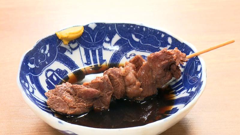 どて焼は、豚と牛のホルモンを使っており、甘辛いみそダレで味付けされています。