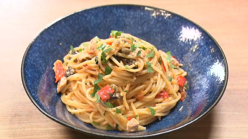 「マグロとブラックオリーブのパスタ」は、ニンニクが効いてパンチがあります。