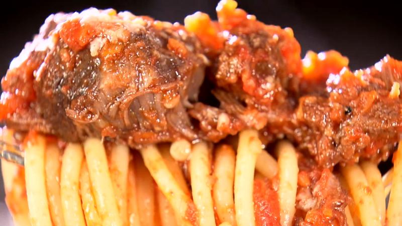 スネ肉の挽肉で作ったミートソースと、スネ肉のブロックを赤ワインで煮込んだもの2種類を合わせています。それぞれ調理法を変えています。煮込むのだけでも3時間はかかるので、約1日かけて作っています
