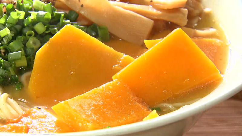 鮮やかなオレンジ色のスープに、カボチャをごろごろトッピングした見た目にも美しいラーメンです。