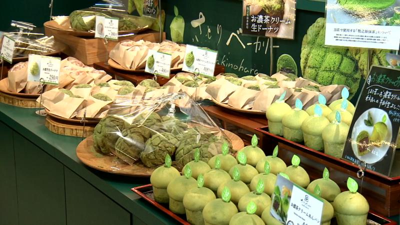 食パンやメロンパン、ドーナツなど、静岡県産の抹茶をぜいたくに使ったパンがずらりと並んでいます。