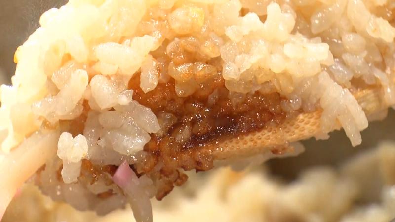 まさに職人技です。中にはかまぼこ・レンコン・シイタケ・タケノコ・ショウガが入っていて、レンコンの歯ごたえも絶妙です。