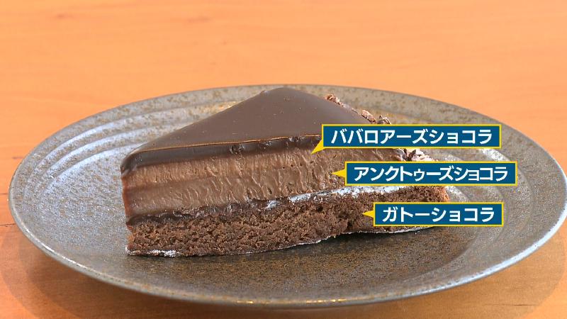 一番上を除いて、3層あります。下からガトーショコラ、アンクトゥーズショコラ、ババロアーズショコラです