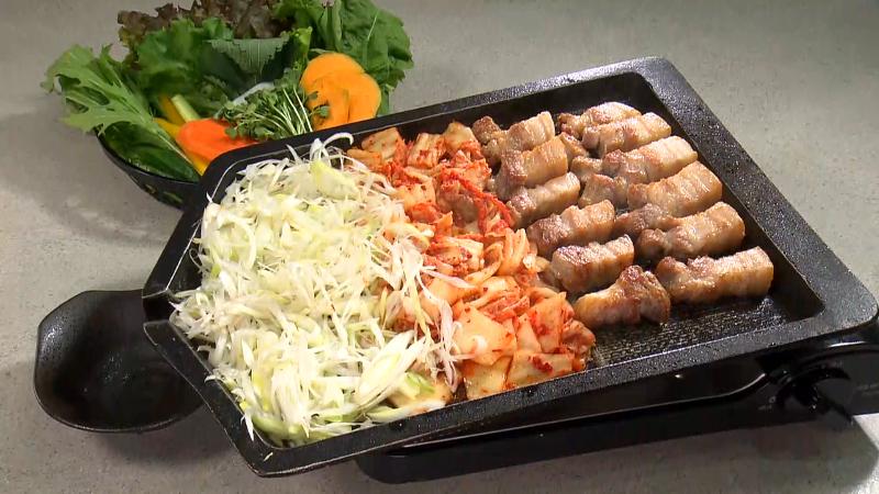 豚バラ肉、キムチ、ネギを熱々の鉄板で焼く、韓国を代表する人気料理です。