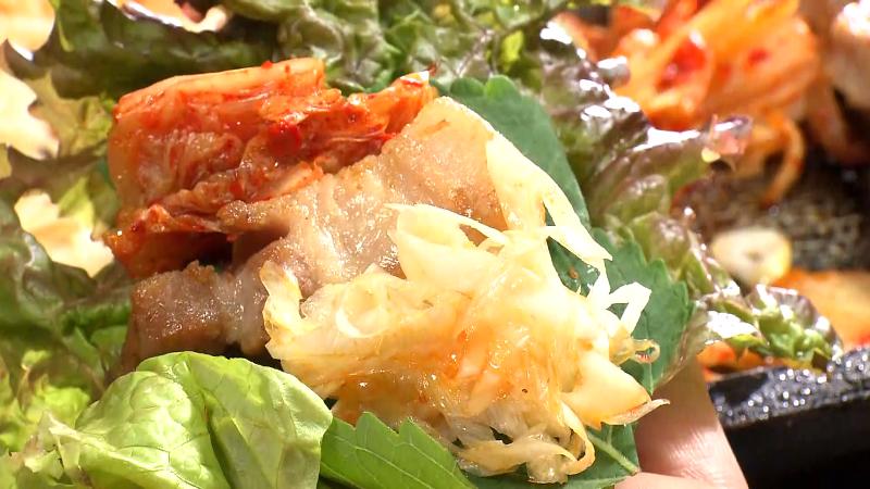 焼き立てをサンチュに巻いて食べると、お肉は柔らかくてプリプリ。すごく弾力があります。