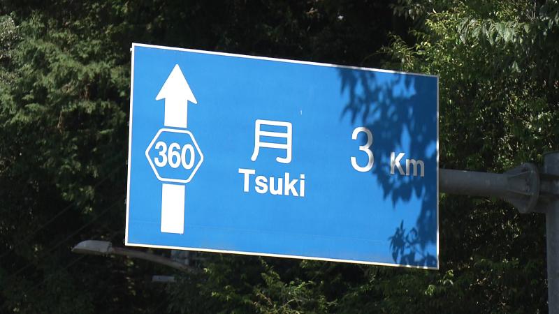 少し歩くと何とも不思議な、「月まで3㎞」と書かれた青い案内板を発見しました。読み方は「Tsuki(つき)」。月へと導かれているようです。