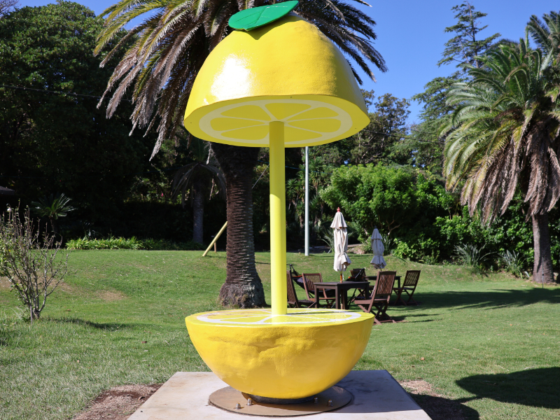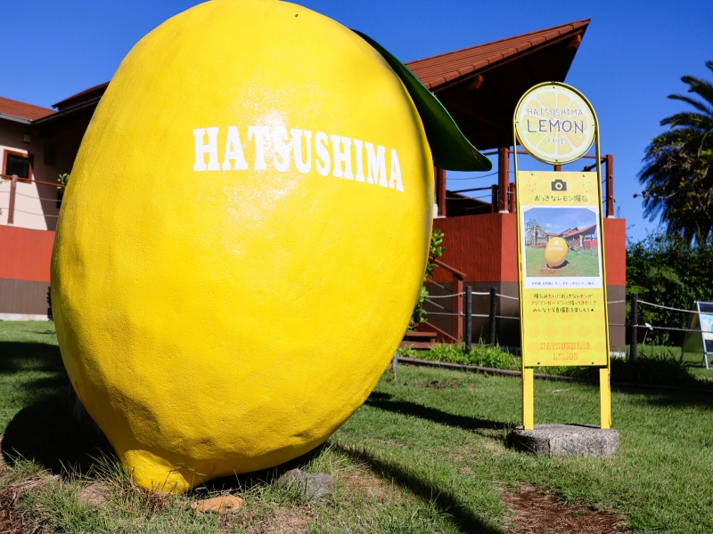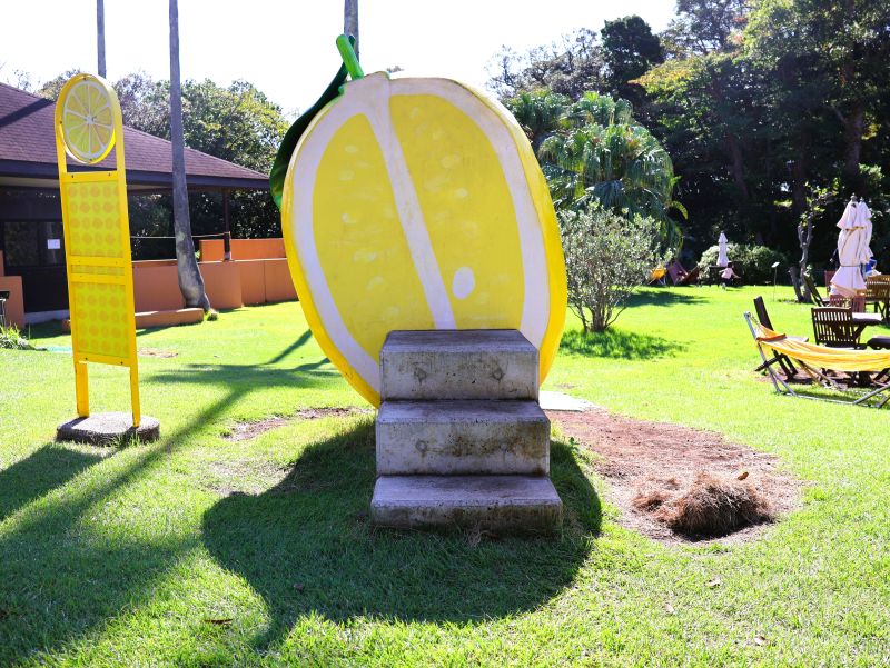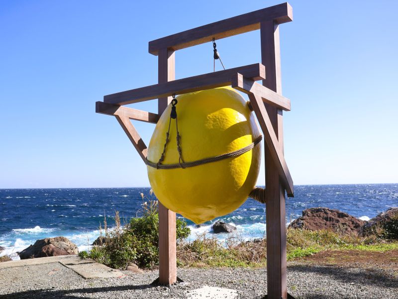 初島港から時計回りで遊歩道を300mほど進むと、リゾート施設「PICA初島」の看板の前に、ひときわ目を引く巨大なレモンの像が現れます。