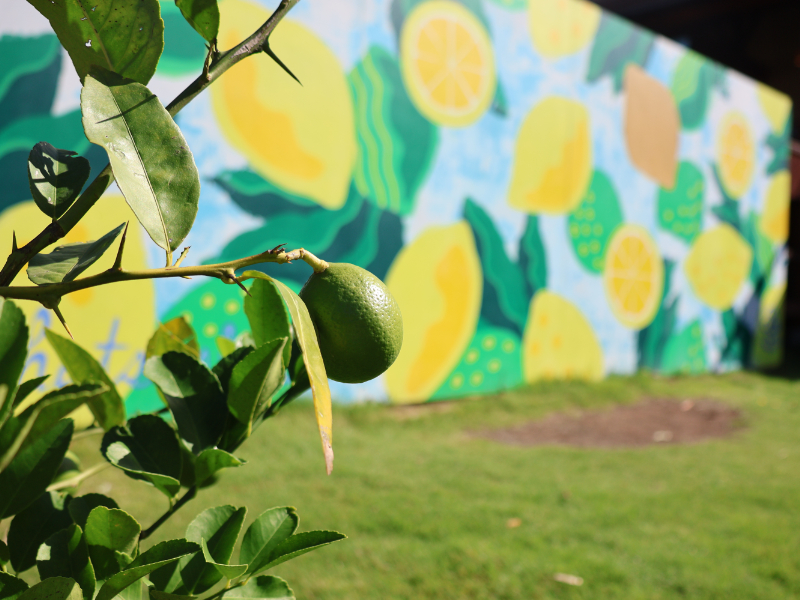 さわやかなレモンとグリーンレモンが美しい、アーティスティックな壁「Lemon Paradise」も、フォトスポットのひとつ。壁の前で、全身でポーズを決めましょう。