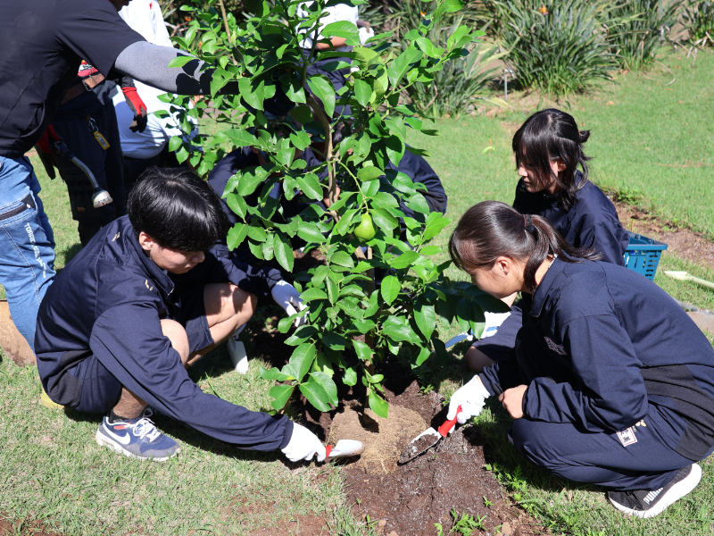 植え終えると、生徒たちは周りの土をやさしくかぶせ、最後にホースで水をまいて作業完了。