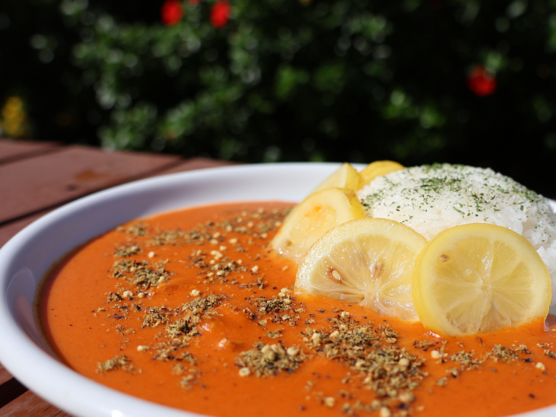 初島で味わう人気のレモングルメのひとつ「レモンスパイスカレー(1300円)」は、バターチキンカレーに、カルダモンを含む香辛料やスパイス、レモンが乗っています。