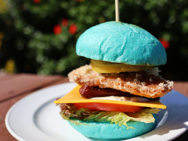 水色のバンズがひと際目を引く「初島バーガー(1300円)」も、人気のレモングルメです。