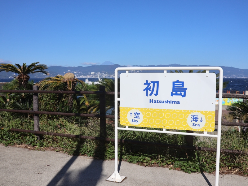 前後の駅名は「空」と「海」。その途中駅が「初島」という設定。天気がよい日は熱海の街並み向こうに富士山が見えます。