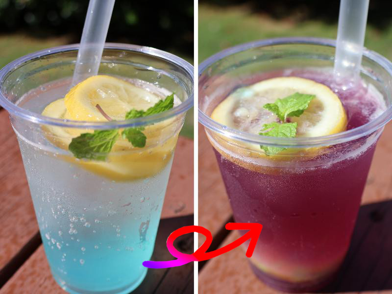 シロップをかけることで、色が水色から紫色に変わり、さらにベリー風味の味も追加されるため、2種類の味と色が楽しめます。