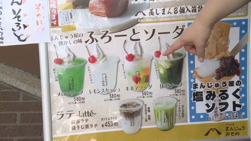 ソーダフロートも魅力的ですが、みそのの主力商品はまんじゅうです。黄色い看板には「あげまんじゅう」「蒸しまんじゅう」の文字が並び、店内のショーケースにはさまざまな和菓子が並んでいます。