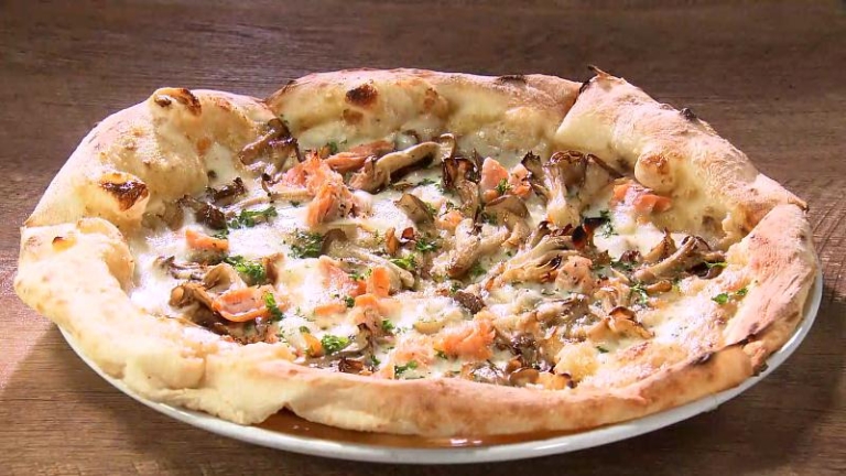 【清水区・ステイゴールド】脂がのったサケと4種のキノコ 秋のもちもちクリームピザ