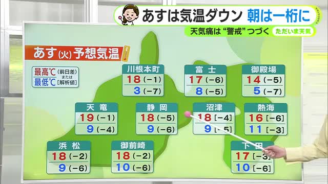 最低気温は、一桁の所が多くなる予想です。静岡・浜松は9℃の予想で一桁となれば1週間ぶりとなり、久しぶりの寒さになります。最高気温も下がって20℃に届かない予想ですので昼間も、10日(月)に比べるとヒンヤリします。
