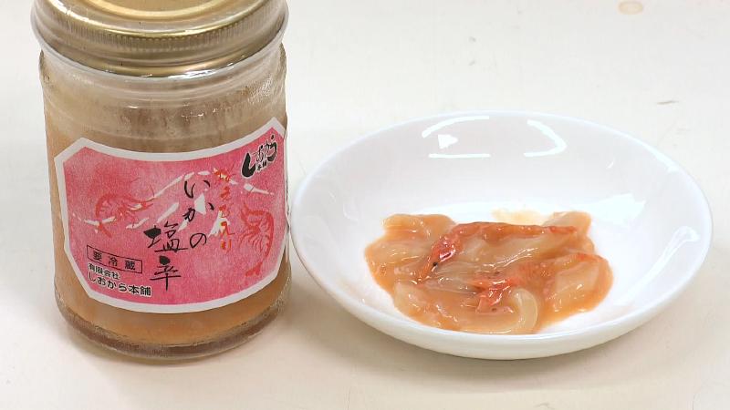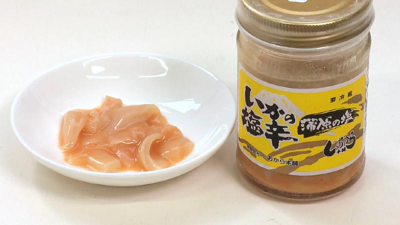 続いて“駿河湾の宝石”が入った「桜えび入り いかの塩辛(2本売り1340円/1600円※組み合わせにより変わります)」。立派なサクラエビがたっぷりと入っています。