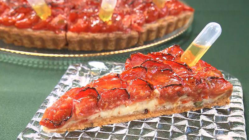 通常のタルト生地を作る時に入れる水分を、トマトのタルトだけはトマトジュースで作っています。タルト生地から全部トマト一色で、全く砂糖を使っていない塩味の効いた生地です
