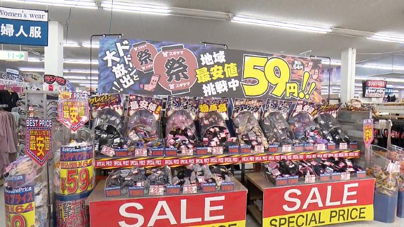 入ってすぐに目を引くのは、大量の靴下。「地域最安値挑戦中」と書かれた値札には、なんと59円(税別)の文字。