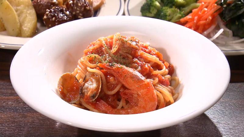 ソフトシュリンプ・ヤリイカ・アサリ・ホタテが入った豪華なトマトパスタです。