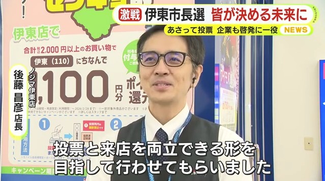 12月14日、投票日を迎える静岡県伊東市の市長選挙は11日までに期日前投票を行った人が前回を大幅に上回っています。より多くの人に市の未来を考えてもらおうと企業も投票率アップに貢献しています。