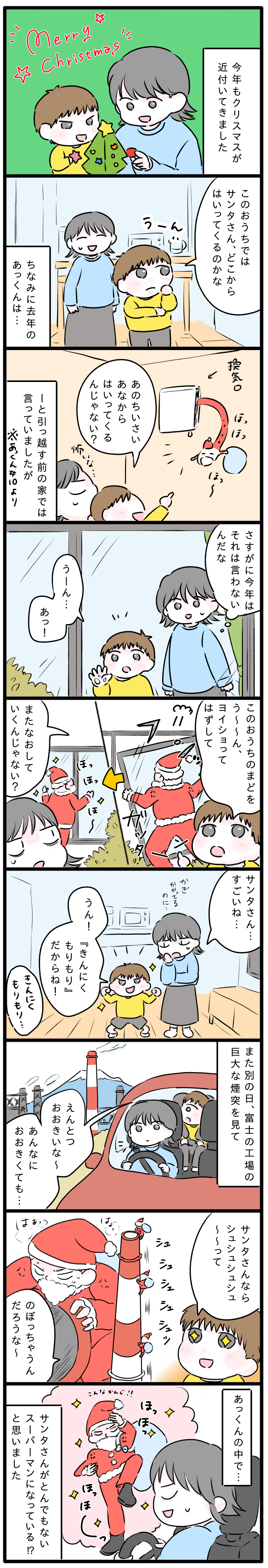 2025年12月20日 暮らす 【マンガ】5歳児が妄想するサンタが妙に“マッチョ” 元気ばくはつ! 富士っ子あっくん#23〜 クリスマスマンガ子育て ここまる 元気ばくはつBOYのあっくんに振り回されながらも育児を楽しむ母・ここまる。そんな子育てのアレコレを富士山のお膝元、静岡・富士市よりお届けします。今年もクリスマスが近づき、「サンタはどうやって家に入る?」という疑問に、あっくんの妙な妄想がさらに膨らんでいます。 作/ここまる 【もっと見る! 富士っ子あっくん】 【マンガ】「サンタはどこから」4歳児の答えがまさか!?だった 〜元気ばくはつ富士っ子あっくん#10〜 【マンガ】3歳児の反応が“胸キュン”過ぎた件 〜元気ばくはつ!富士っ子あっくん#5〜