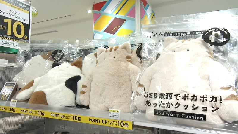 ネコ型のかわいらしいデザインの「ネコティ USBウォームクッション(4620円)」は、クッションの中に手を入れられます。