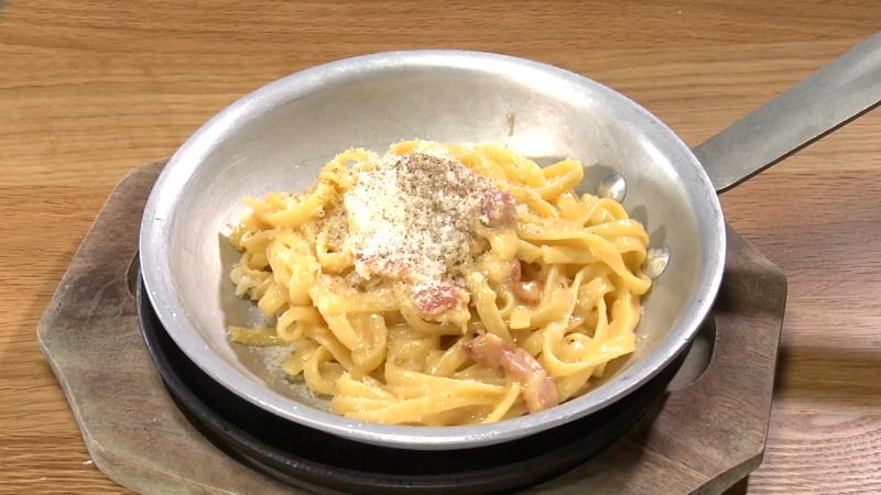 特製平打ちパスタを、イタリア産チーズの上で直接和えた超濃厚カルボナーラです。