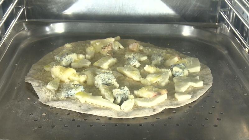 高温で2度焼きすることで、さらにサクサクの生地になります。生地だけの状態で200度で3分。その後にチーズをのせて焼き上げています。