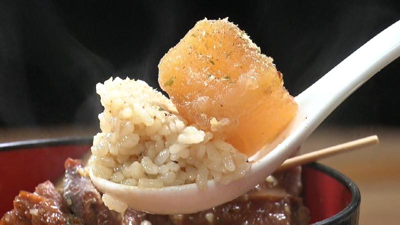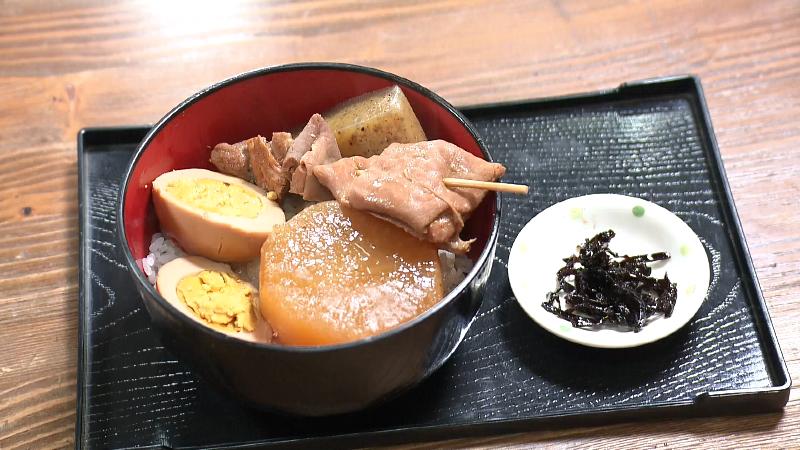 運ばれてきたのは、白いご飯の上に4種類のおでんが乗った「おでん丼(650円)」。初めて見る料理に思わず「なるほど!」と声が上がります。