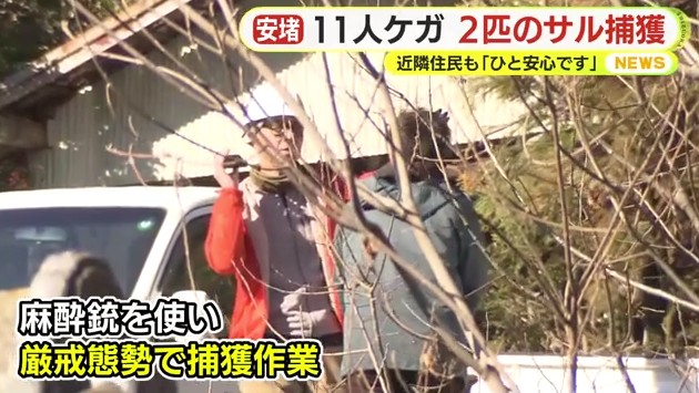 市は人への被害が出ているため、4日から麻酔銃を使った捕獲に乗り出し、5日午前に子ザルとみられる1匹を捕まえ、6日昼頃には親ザルとみられる1匹の捕獲に成功。