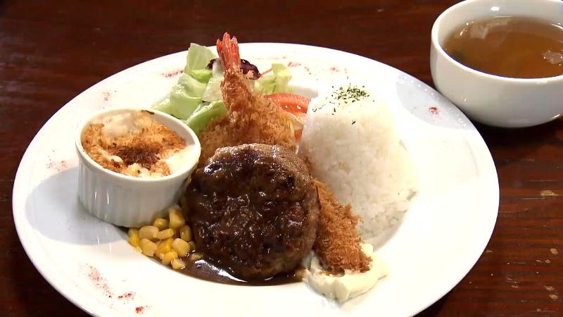 ハンバーグにエビフライなど、洋食の定番メニューが一度に楽しめるプレートです。