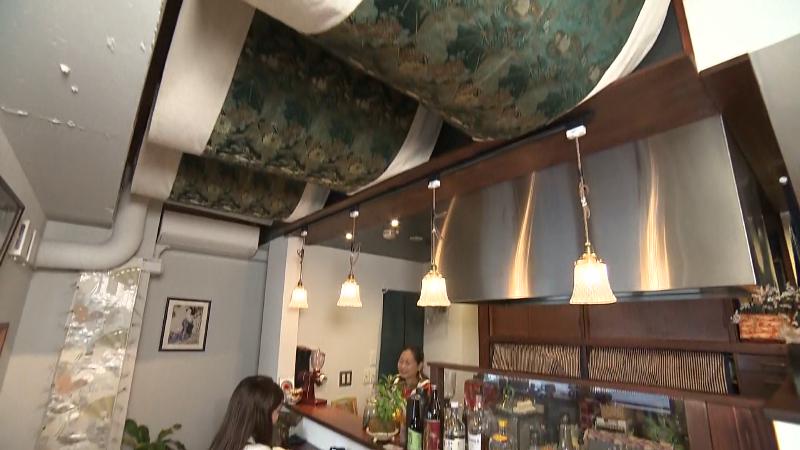 中に入ると、温かみのある和モダンな店内が広がっていました。まず天井を見上げてみてください。波打つように飾られているのは西陣織です。