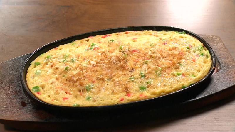 山芋の粘りとほどよい歯ごたえは、お好み焼きともんじゃ焼きの中間のような、独特の味わいです。とん平焼きにも似ています。