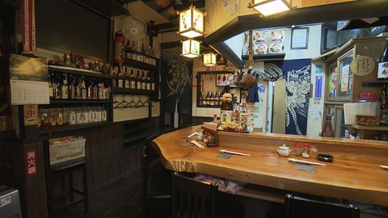 店内に入ると、立派な木目の一枚板のテーブルがあります。居酒屋らしい温かみのある雰囲気で、壁際には日本酒が並んでいました。