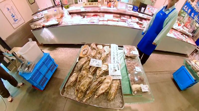 南口から入って1軒目、「魚の北辰」という店の前には、巨大なカキが氷の上に大量に置かれていました。