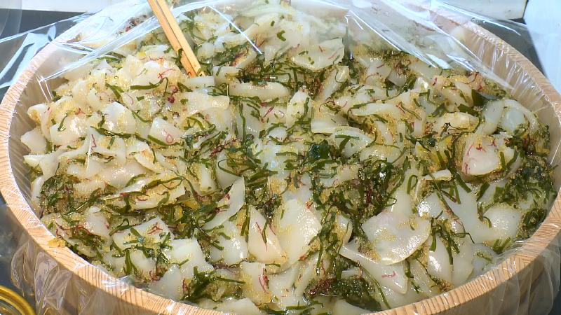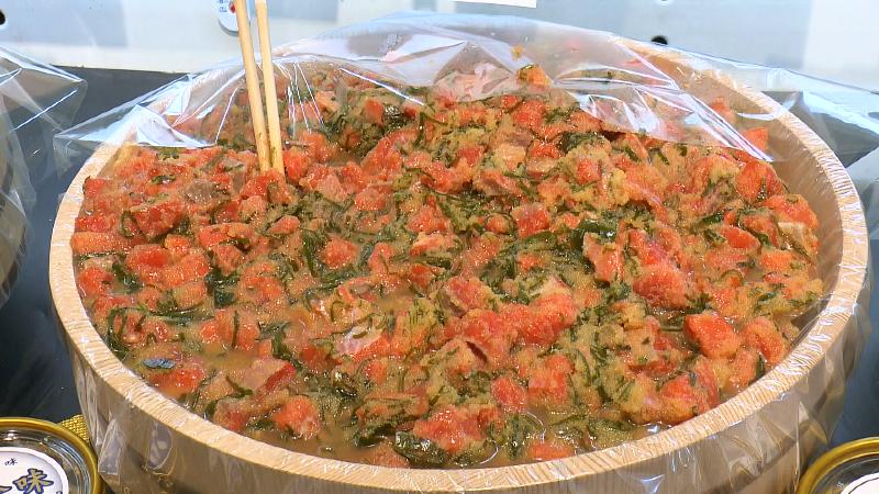 サケの松前漬け「王様の紅鮭(90g・1000円)」は生のサケを使った一番人気の商品です。