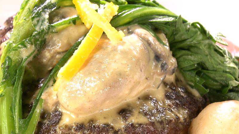 ハンバーグと一緒にカキを口に入れるのが、最高にぜいたくな楽しみ方。口の中が楽園のようになりますよ。