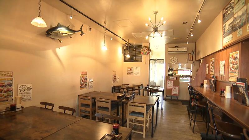 店内はテーブル席とカンター席があり、壁にかかったマグロのオブジェが雰囲気を盛り上げます。