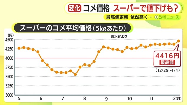 9日に発表された1月4日までの1週間のコメの価格は5kgあたり4416円で最高値を更新しました。